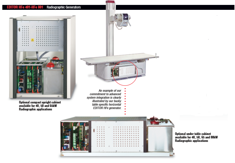 La série EDITOR HFE à rayons X varie de 40 à 80 kW. Ces générateurs sont compatibles avec la plupart des tubes à rayons X, des intensificateurs d'image, des capteurs plan et disposent d'une interface flexible. Avec sa construction modulaire et sa conception flexible, la série EDITOR HFE peut être facilement installée, entretenue et intégrée.